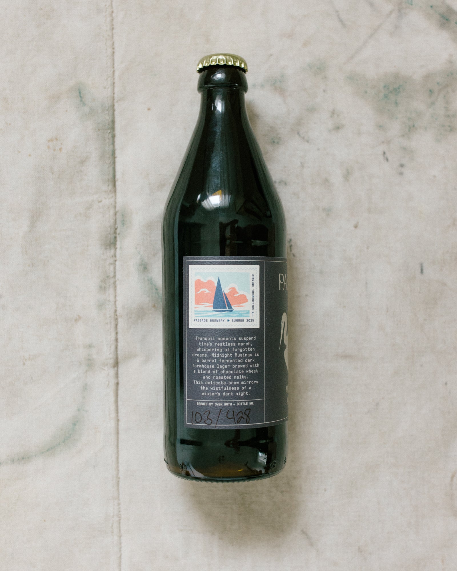 Tranquil moments suspend time's restless march, whispering of forgotten dreams. Midnight Musings is a barrel fermented sour dark farmhouse lager brewed with a blend of chocolate wheat and roasted malts. This delicate brew mirrors the wistfulness of a winter's dark night.